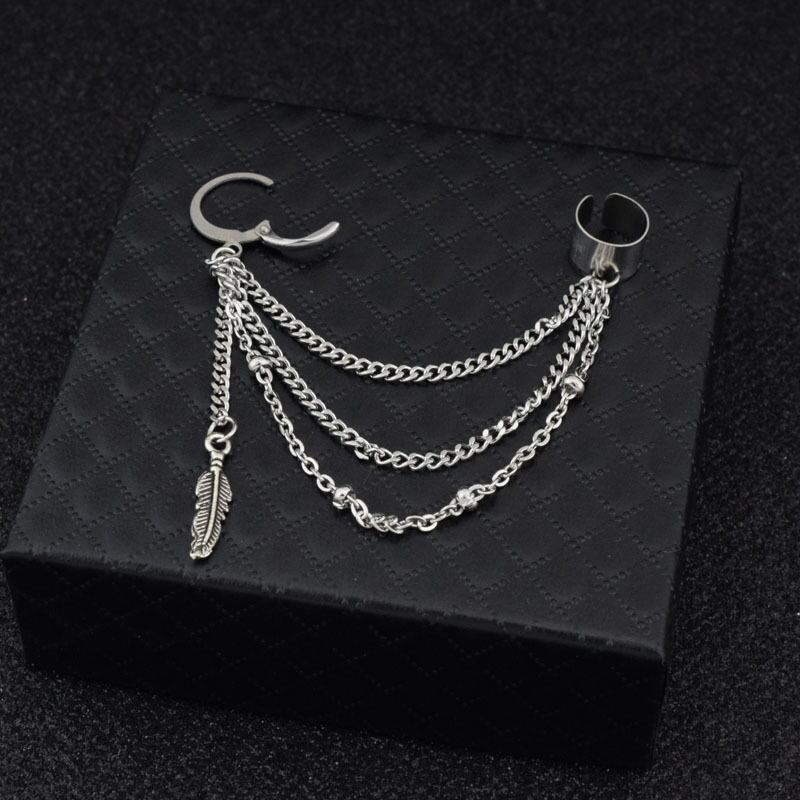 Liberty-M ロングチェーン フェイクピアス ピアス イヤリング V テテ着用タイプ フェザー付き 人気モデル